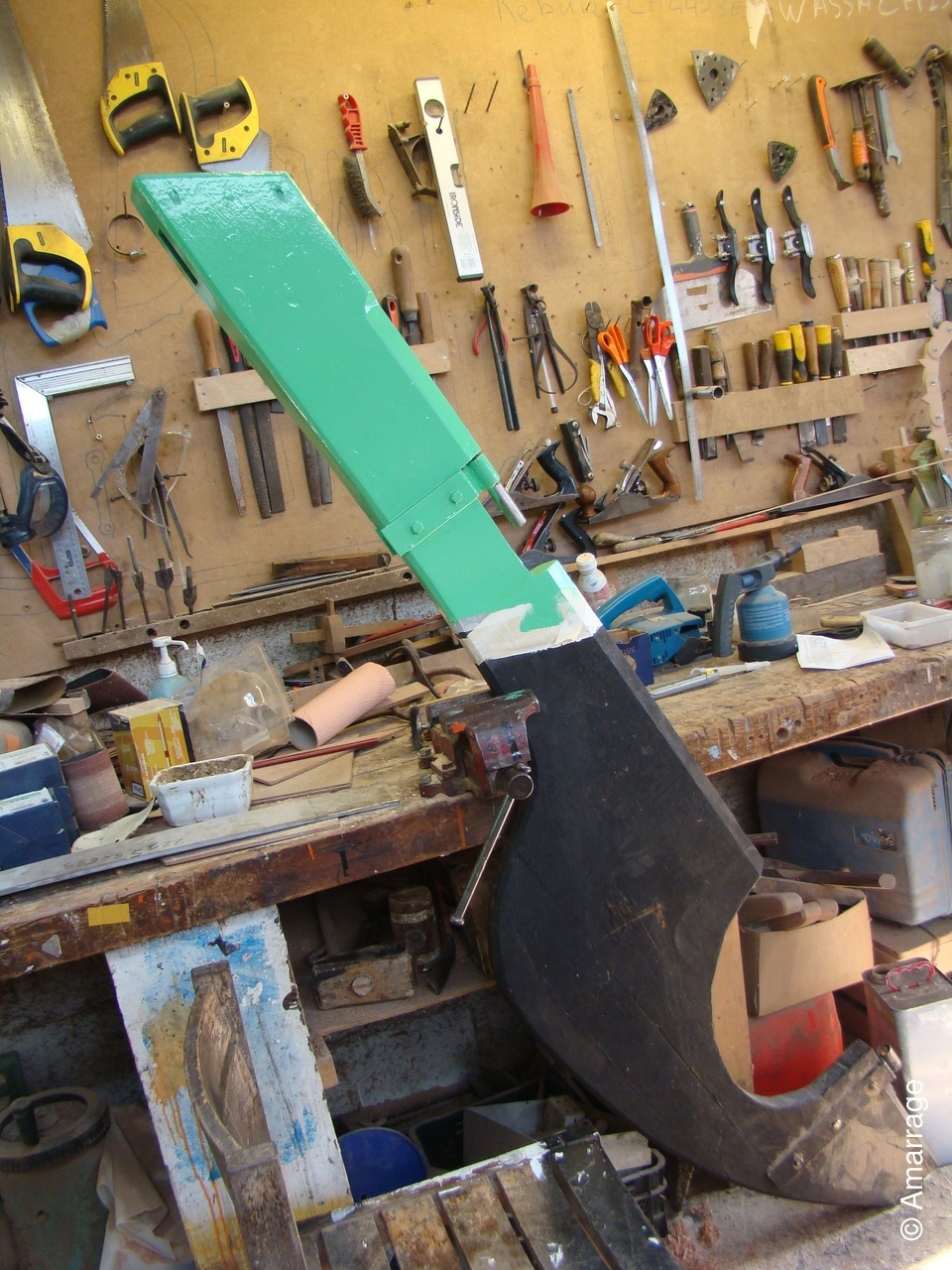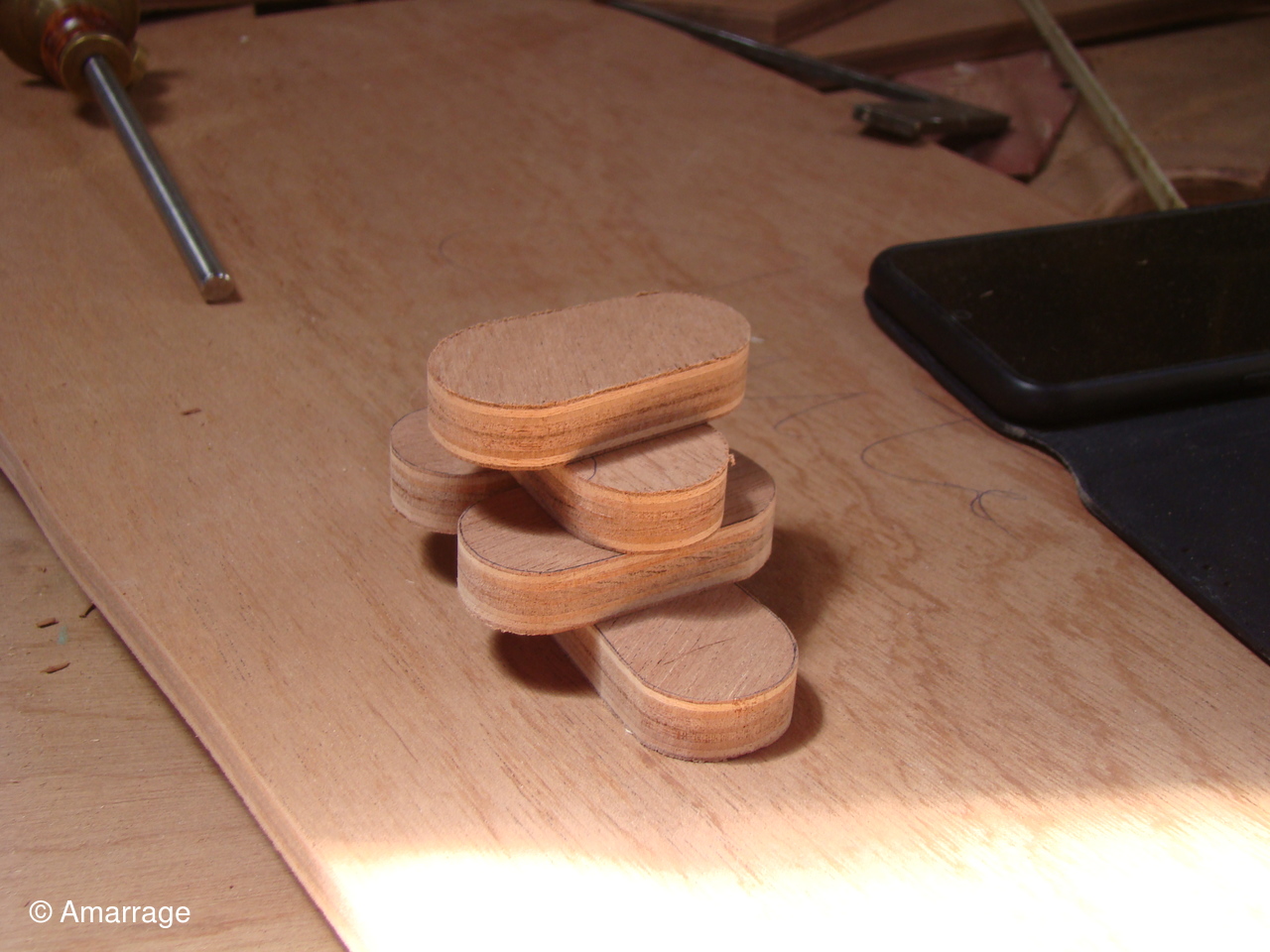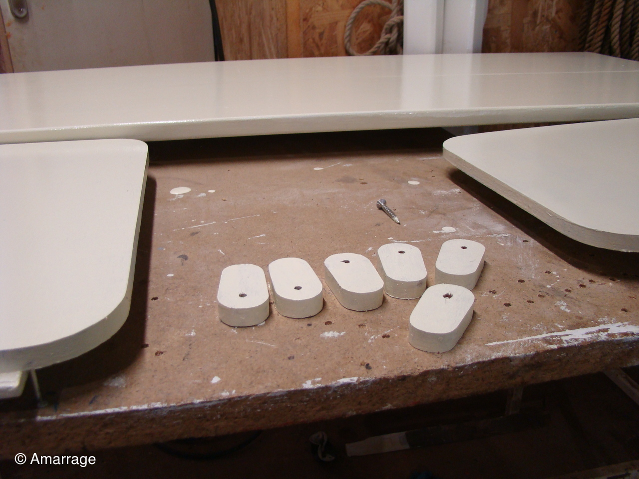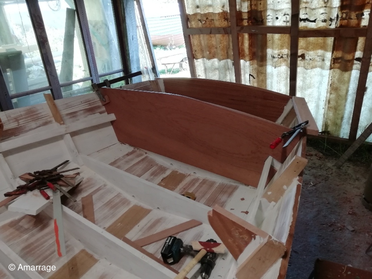 "GUEPARD": Egrenage de la coque interne avant la 1ère couche de peinture laquée- la première de peinture laquée est passée, ainsi que les bancs, portes de cloison et système de fermeture des portes- fabrication en CP du gabarit de la dérive-découpe des pièces de CP pour le safran.