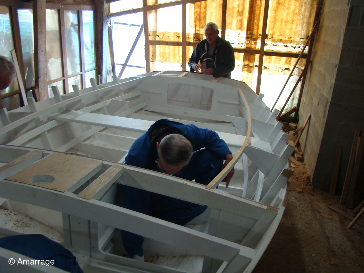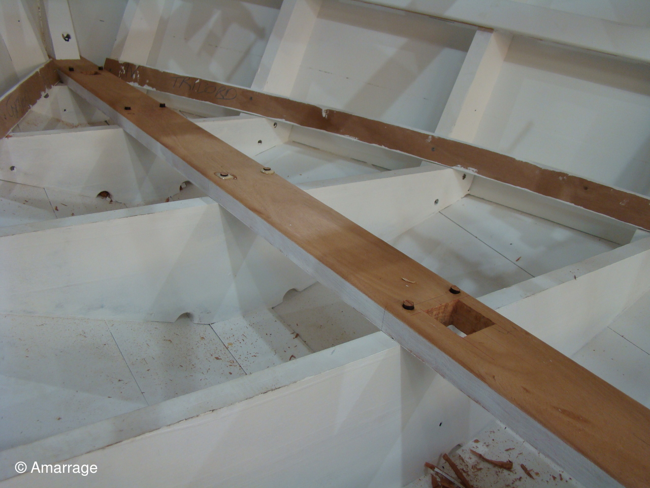 "GUEPARD": le brai a été couler à l'avant du Guépard- le banc central a été mis en place- massif au dessus du puits de dérive- installation des cloisons avant et arrière. (Photos de Ramain).