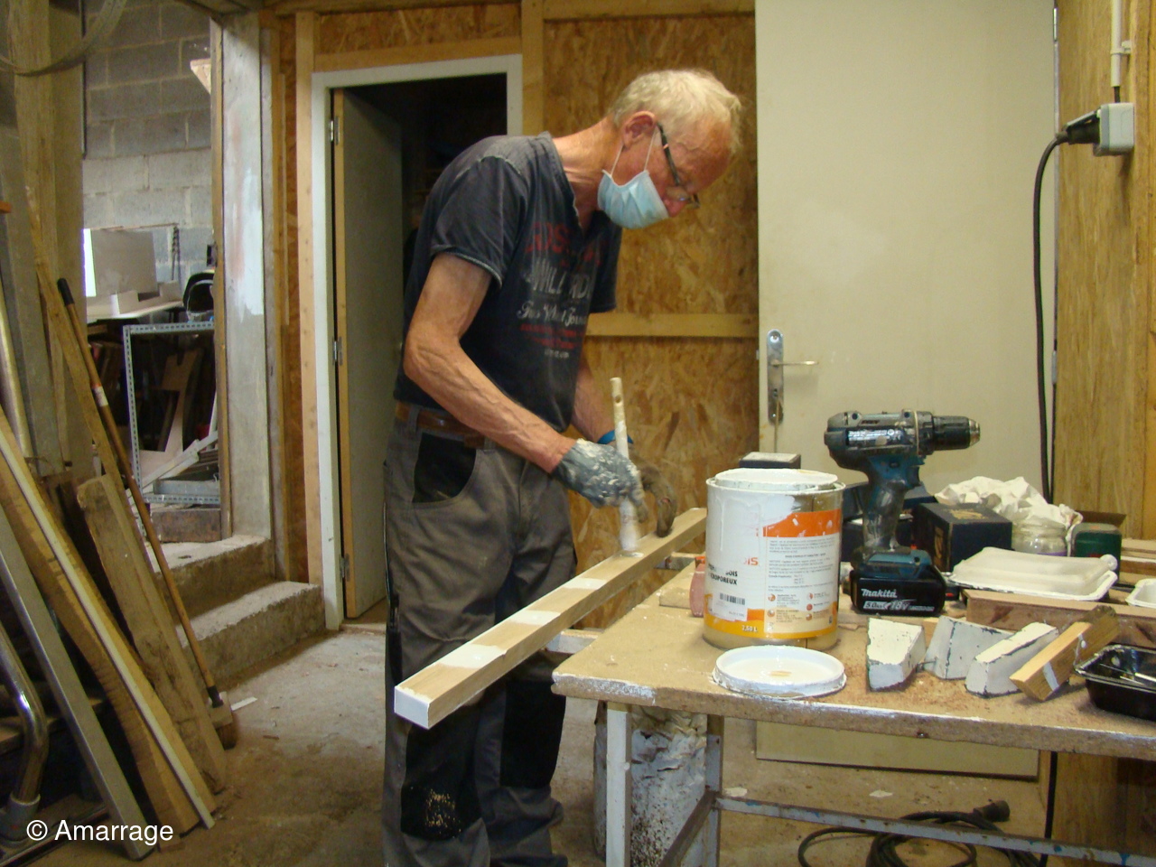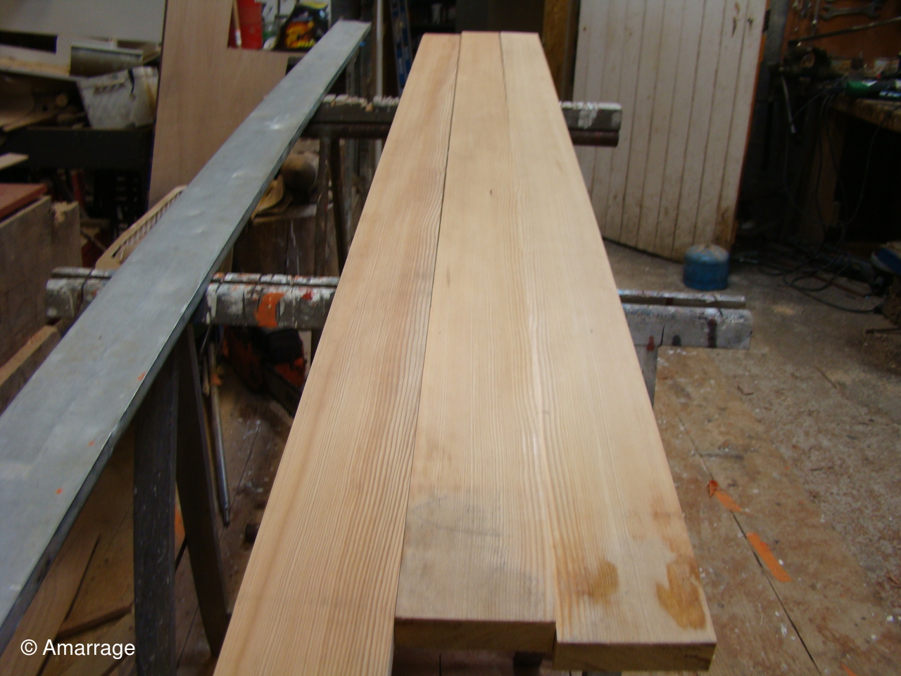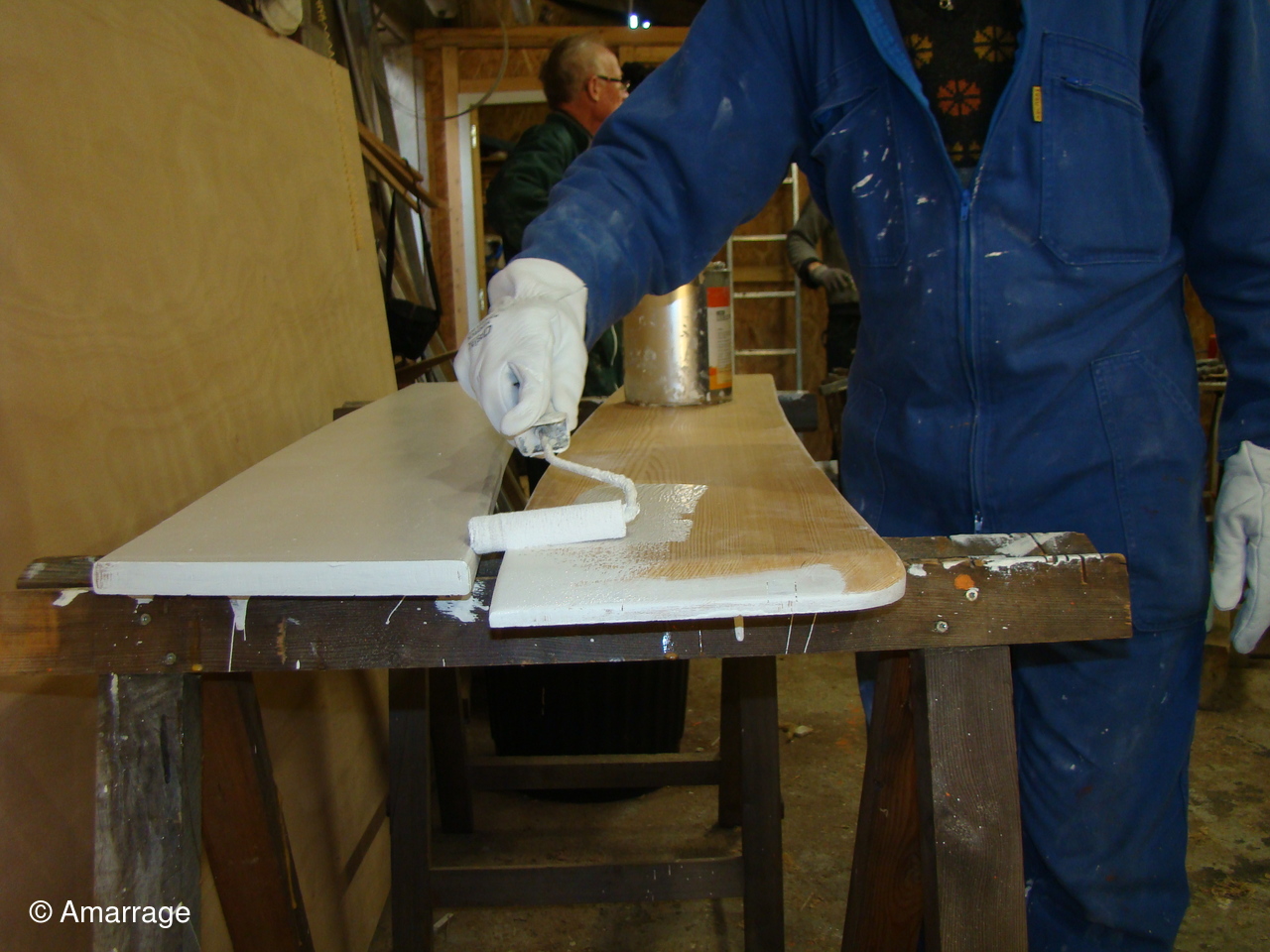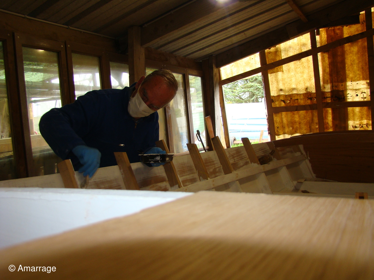 "CATHERINE- PHILIPPE": masticage des bordés- mise en place de la bande molle sur l'étrave.