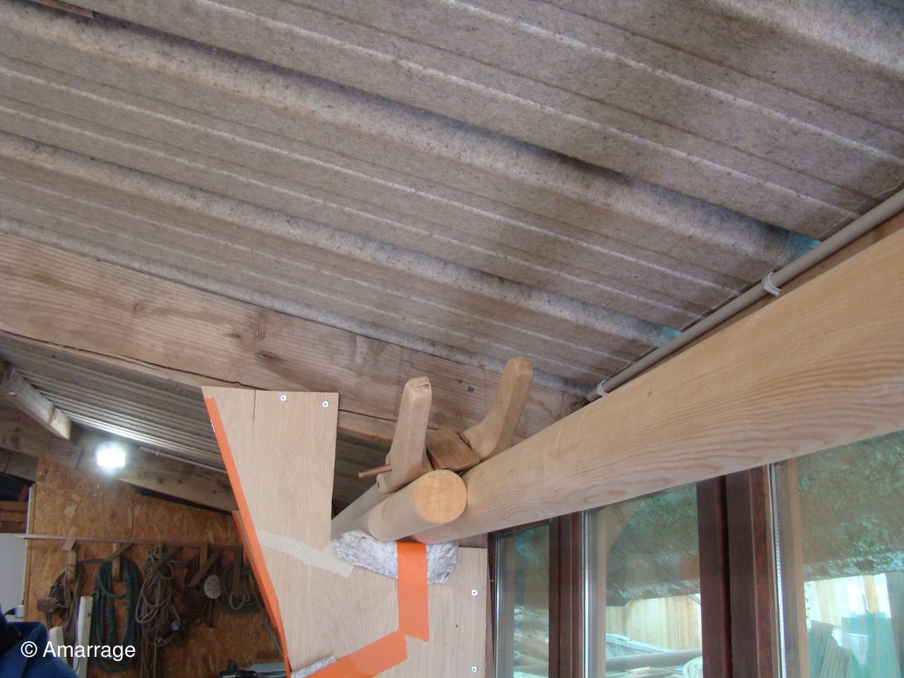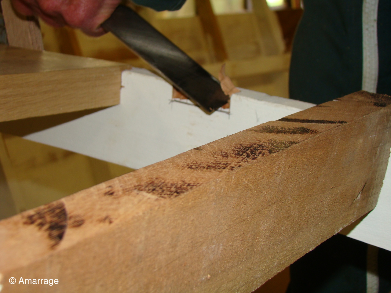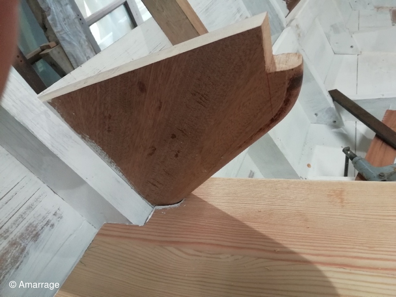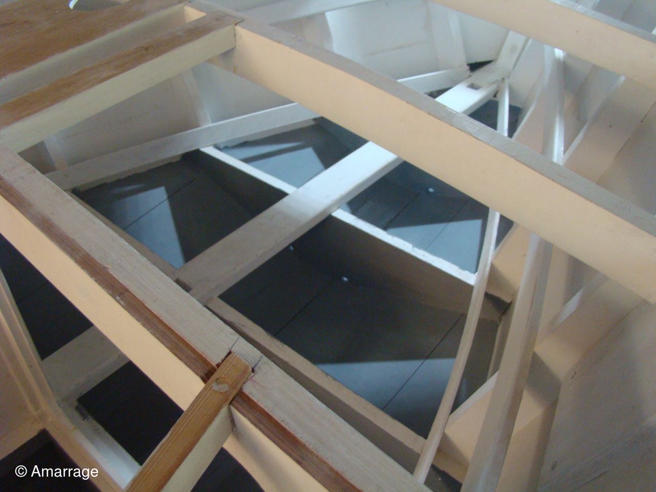 "GUEPARD": Le tableau a été modifié pour recevoir son pont- sur l'avant pièce de chêne entre les barrots pour revoir le mât et la bitte d'amarrage- Fabrication et fixation des courbes d'élongis (6) - fabrication du banc- le mât prend forme- le seau à brai est prêt a être utilisé sur l'avant.