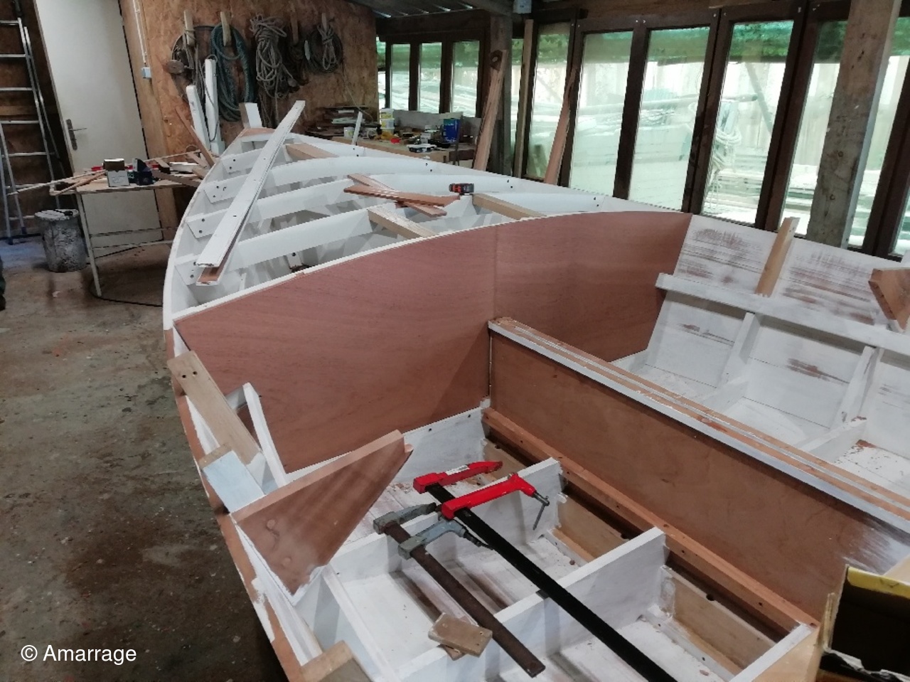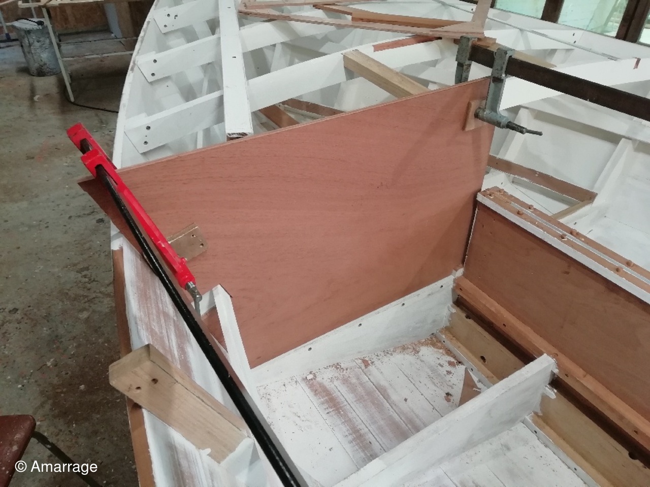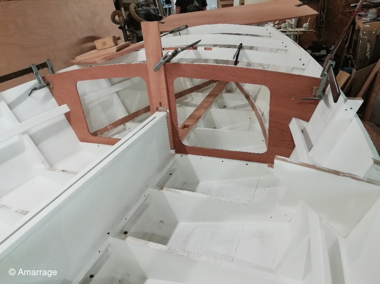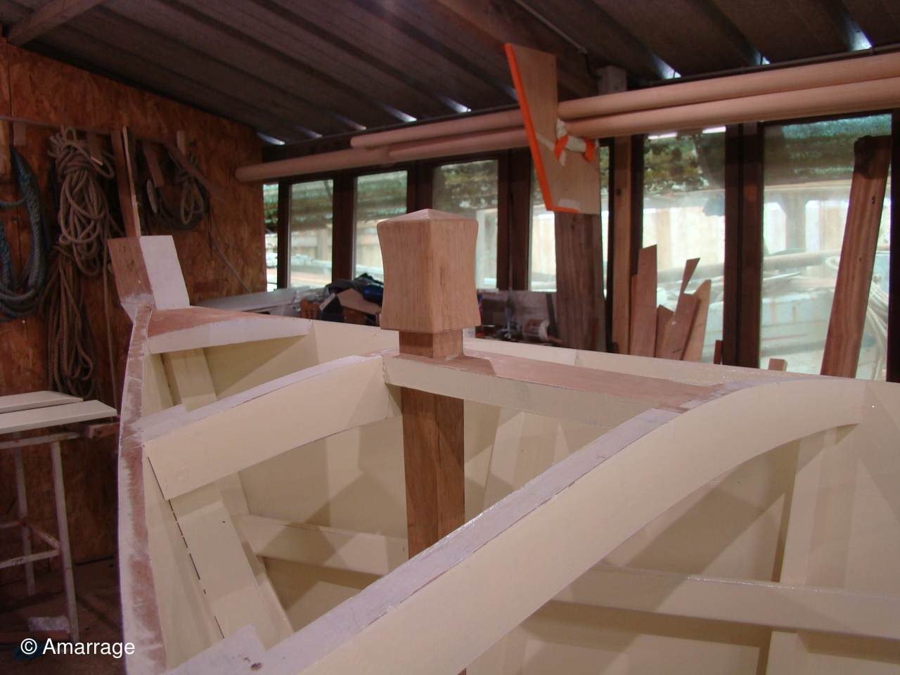 "GUEPARD": Ouvertures sur la cloison avant et arrière avant mise en peinture- mise en place des serres de plancher- fabrication des élongis et mise en place-fabrication du barrot arrière pour le plancher- les renforts de mât et barrots avant ont été collés et vissés - les espars (mât, bôme et pic avec sa fourche) sont bien avancés.
