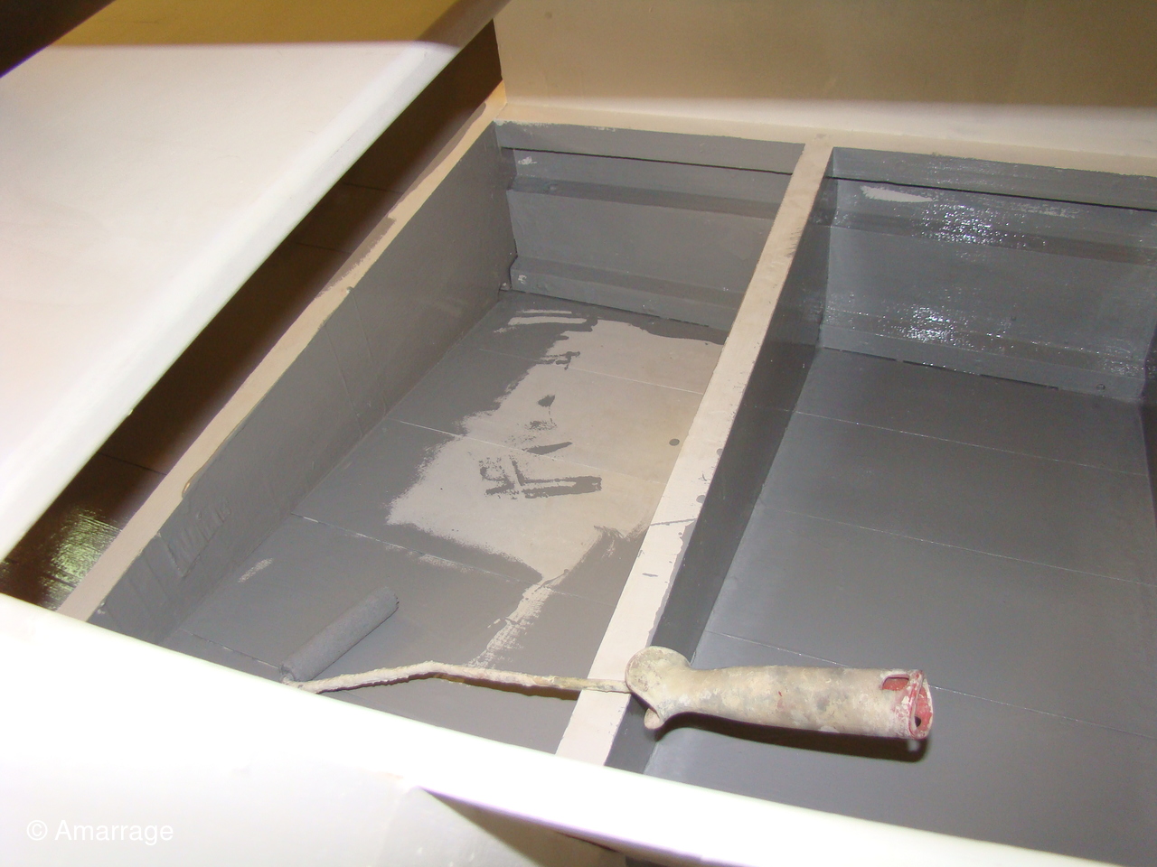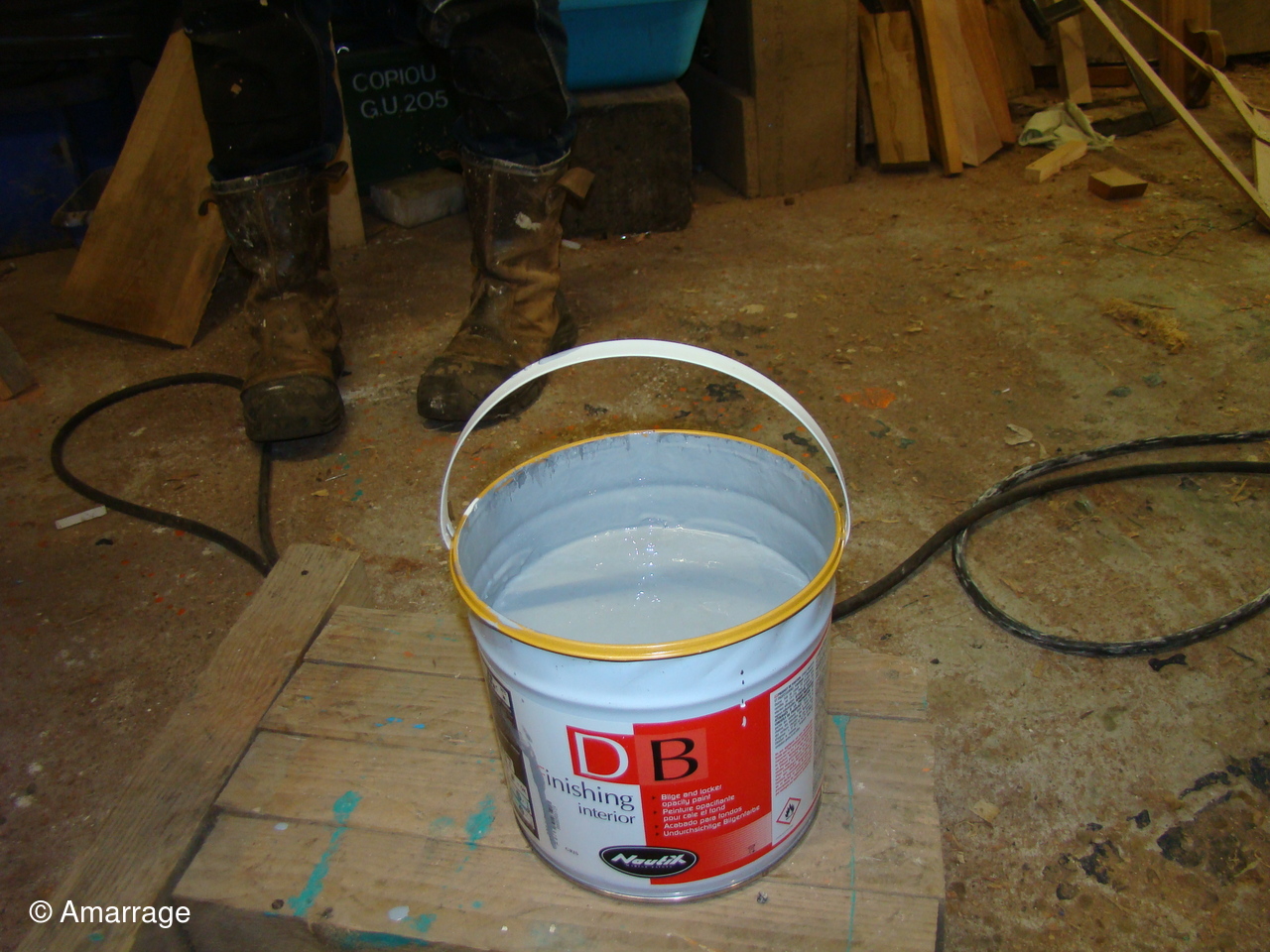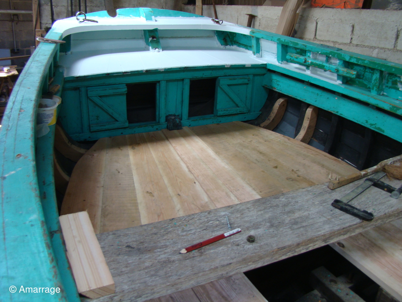 "CATHERINE-PHILIPPE": peinture de la coque externe- le plancher a été déposé et est passé à l'huile de lin.