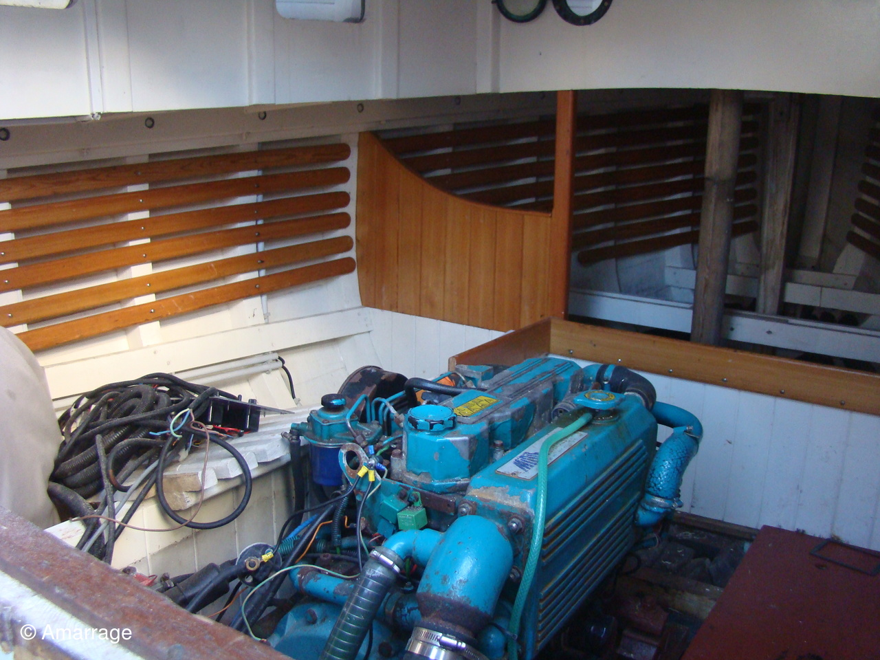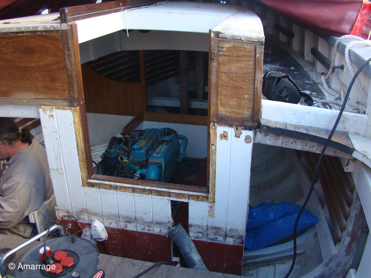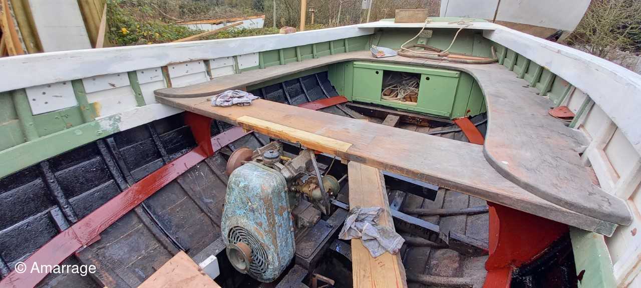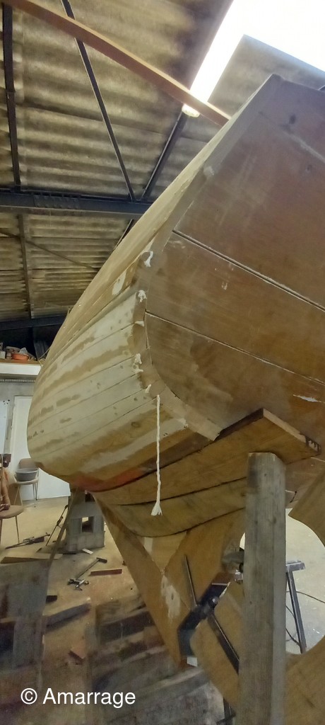 "MARIE JOSEPH": le calfatage est terminé. Encore quelques joints à mastiquer. Travail sur le bâti moteur.Béquilles en cours de réalisation.
