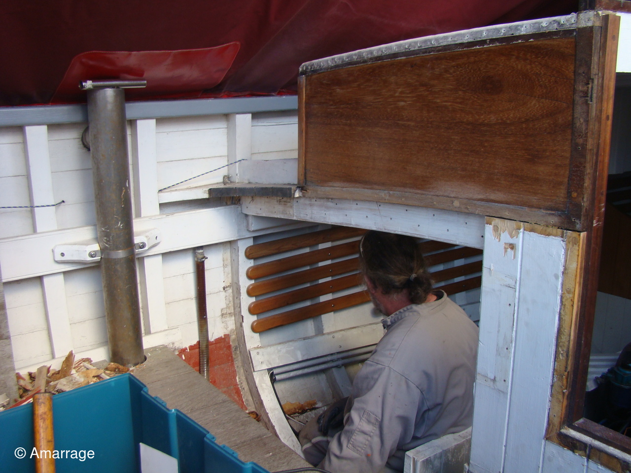 "NEREIDES": est sur le quai pour carénage. Mauvaise surprise sur un bordé à babord. À l'atelier réalisation de la cloison qui est à remplacer.