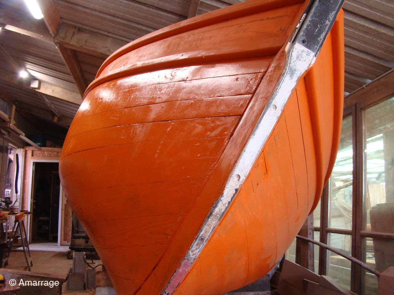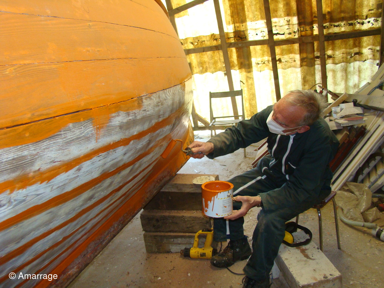 "GAI MARIN": sa restauration se poursuit. Ponçage et mise en peinture (minium) de la coque externe. Prochaine étape le calfatage pour le rendre étanche.