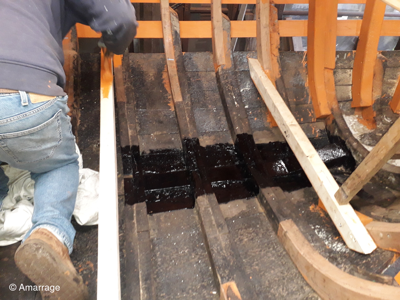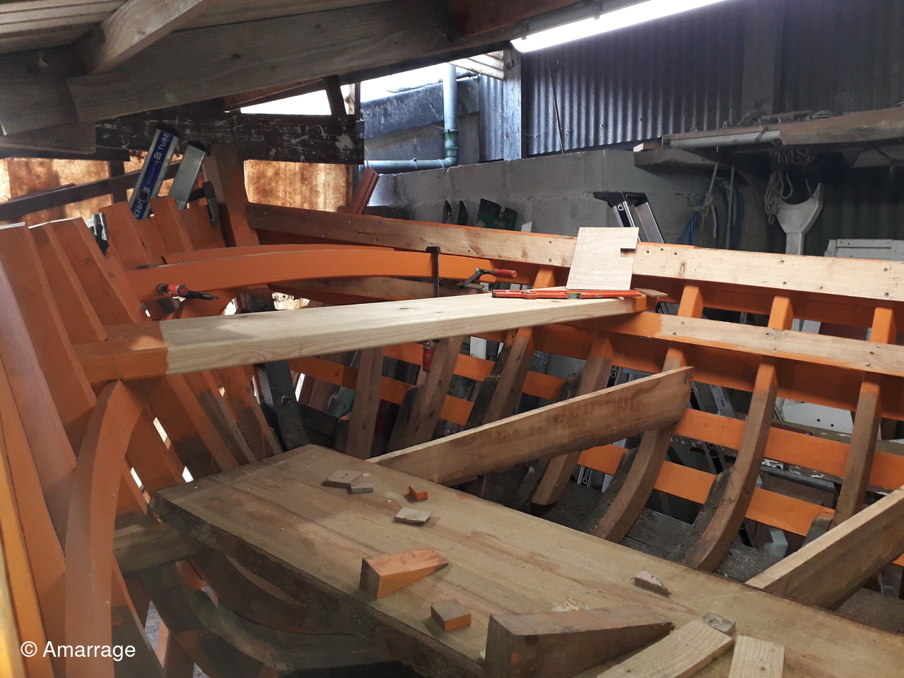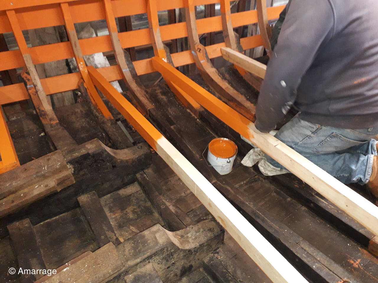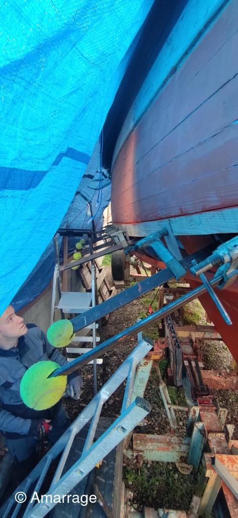 SAINT POL: pose des supports de plancher et mise en peinture - peinture black pour fond de bateau - travail sur l'étrave.