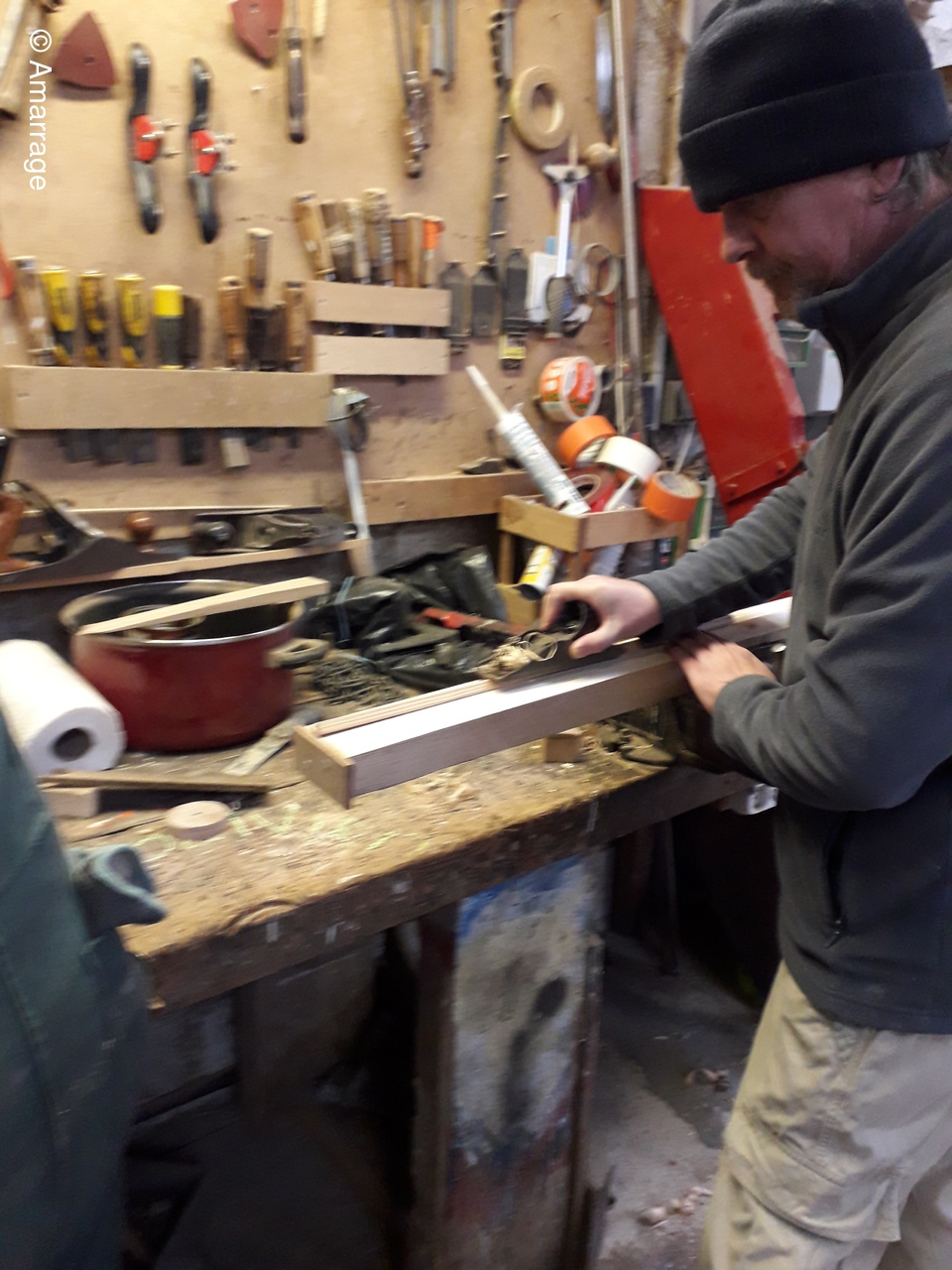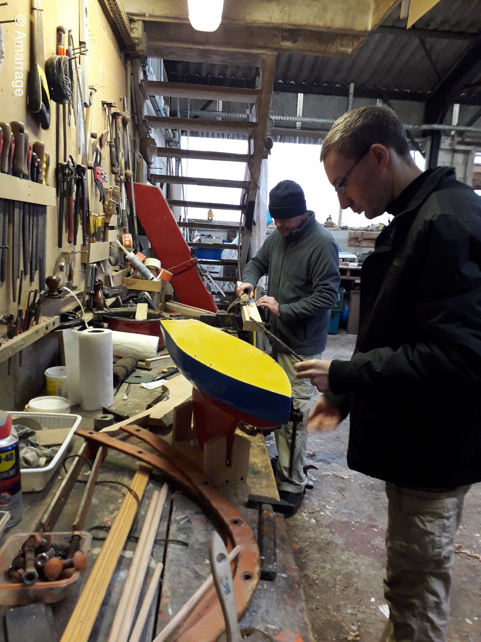 ATELIER: coffrage pour installation du générateur de vapeur (pour étuve) - arbre à chats terminé - bateaux jouets - fabrication d'un fauteuil de jardin (royal) et essayage par des personnalités.