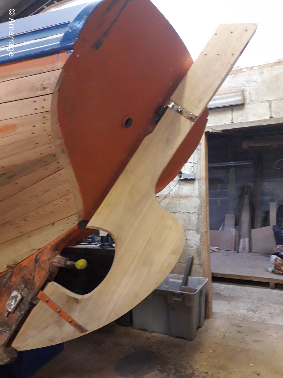 JOLIE BRISE: la coque est fermée - travail sur le safran et mise en place pour essai - confection de la barre de safran.